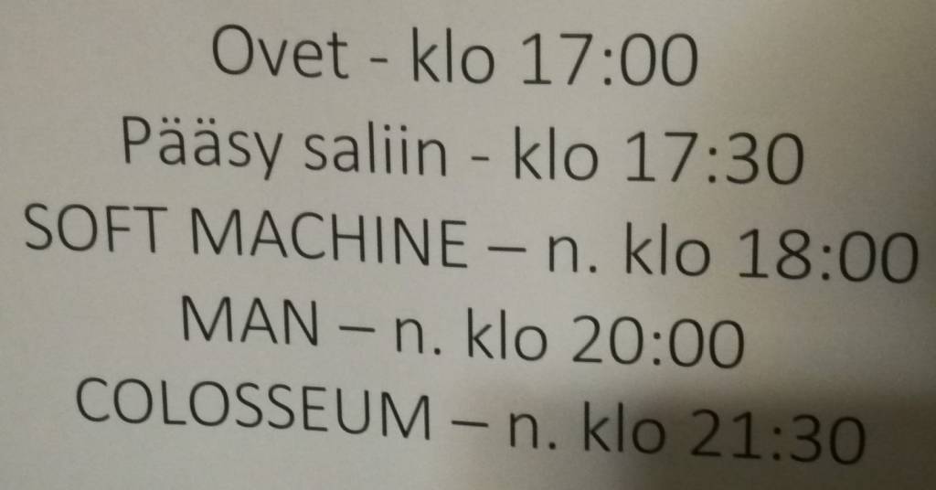 H-hetkellä Kulttuuritalolle saapuivat lopulta vain hardcore proge-harrastajat tai siltä se ainakin näytti paikan päällä. Yli 90% yleisöstä oli miehiä ja lähes yhtä moni oli 50+ vuotiaita. Toisaalta se oli hyvä, tuli ikään kuin “kotoinen” olo kun tunsi olevansa joukossa, joka tiesi jotain kaukaisista 1960- ja 1970-luvuista. Heille ne olivat totta eikä vain jotain epämääräistä historiaa. Hienointa illassa oli se, että yli neljän tunnin musisoinnin jälkeen (keikka päättyi vasta klo 23.15!) nuo kaukaiset ajat olivat muuttuneet taas “lihaksi ja vereksi”. Enpä muista koska olisin viimeksi ollut (tai olenko ollut koskaan?) konsertissa, jossa kuulen niin pitkään pelkkiä instrumentaali-esityksiä sekä niin pitkiä kitarasooloja. Se oli musiikkia kaukaiselta ajalta jolloin kappaleet olivat monimutkaisia ja soittajat kilpailivat siitä kuka pystyi soittamaan pisimpään ja improvisoimaan monimutkaisimman soolon.
