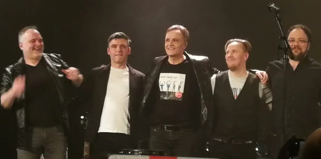 Kahden tunnin aherruksen jälkeen Rock Theatren miehillä on hnymy herkässä, sillä Linnateatterin keikka onnistui erinomaisesti ja yleisökin oli ehkä tavallista innokkaampaa. Esiintyjät vasemmalta oikealle: Charles Plogman, Janne Hyöty, Bo-Anders Sandström, Jere Lahti ja Anton Plogman.