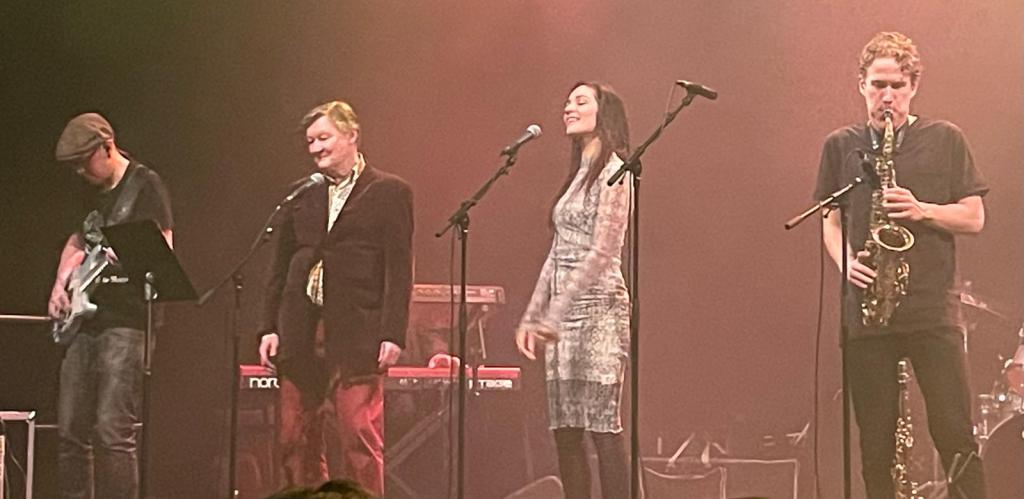 Vesa Aaltosen Prog Band Logomossa 16.11.23. Vasemmalta oikealle: Jere Haakana (kitara), Jukka Gustavsson (laulu), Ella Tepponen (laulu) ja Ilmari Rönkä (saksofoni)
