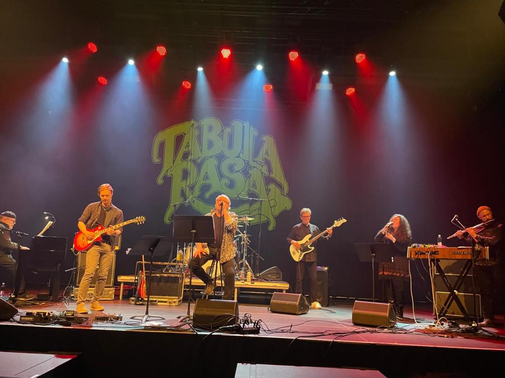 Alkuperäisjäset Asko Pakkanen (rummut) ja Tapio Suominen (basso) rakensivat rytmin perustan. Jukka Salmela (laulu) tuli alkuperäiseen bändiin mukaan vasta vähän ennen sen hajoamista eli 1977. Eilisellä keikalla hän kuitenkin hallitsi alunperin Jukka Leppilammen tulkitsemat kappaleet hienosti. Jukan laulu tosin jäi joissain kappaleissa vähän rumpusoundin alle, mutta sitten taas hiljaisemmissa, rummuttomissa kappaleissa hän lauloi todella hienosti. Ja sitten päästään siihen mikä tekee vuoden 2026 Tabula Rasasta niin valtavan hyvän. Salmelan tytär Anna Salmela laulaa klassikkokappaleiden kuoro-osuudet todella henkeäsalpaavan kauniisti. Ajoittain paikan päällä se kuulosti jopa hienommalta kuin levyllä! Harvoin olen sellaista kokenut. Tabula Rasan luovan dynamon Heikki Silvennoisen isoisiin saappaisiin oli astunut poika Kemmo Silvennoinen . Hän soitti hieman eri tavalla kuin mitä Heikki soittaa levyllä, mutta pienet poikkeamat sallitaan kun lopputulos on niin hieno kuin mitä se hänen sooloissaan oli! Ja sitten vielä Markus Pajakkala (huilu ja hammond-urut): todella kovan luokan muusikko! Lopullisena tukena mukana oli Jorma Kahilainen (piano).