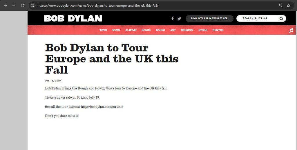 Todennäköisesti alla oleva listaus ei ole lopullinen eli varmaan sinne tulee vielä keikkoja lisää mutta julkaisen tämän nyt poikkeuksellisesti koska nykyinen listaus todistaa ettei Dylan tulee keväällä tai kesällä Eurooppaan. Listaus tosin jättää pienen aikaikkunan loppuvuoteen. Dylanhan on käytännössä joka vuosi keikkaillut myös Euroopassa. Aika näyttää muodostaako vuosi 2025 tästä poikkeuksen.