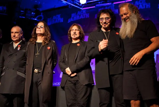 Vuonna 2013 ilmestynyt Sabbath albumi 13 oli valtava menestys! Kuvassa Sabbathin alkuperäinen miehistö. Vasemmalta oikealle: Ward (rumpali), Ozzy (laulaja), Butler (basisti), Iommi (kitaristi) ja levyn tuottaja Rubin.
