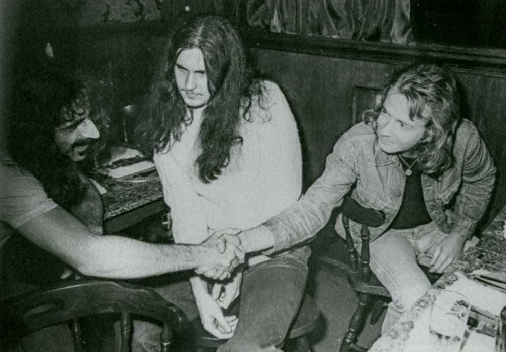 Pekka Pohjola tapasi Frank Zappan helsinkiläisravintolassa vuonna 1977. Pekka on kuvassa keskellä ja Zappaa kättelee tässä Vesa Aaltonen.